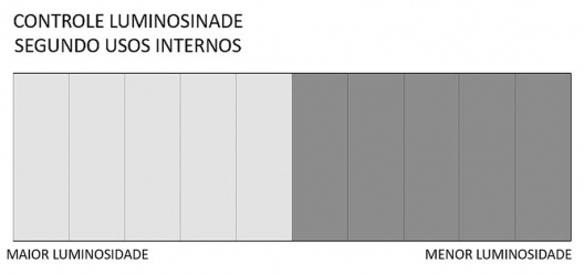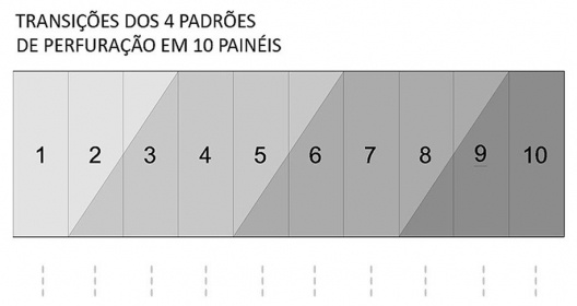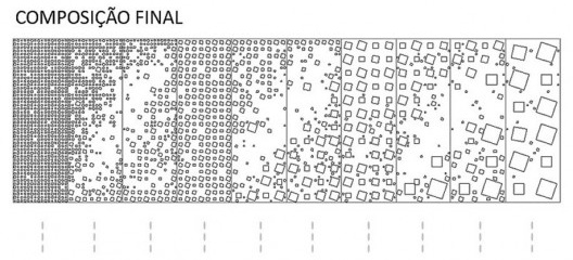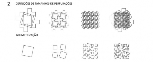 A partir de um modulo inicial matemático desenha-se um “código” de perfurações que será aplicado às superfícies. Depois, uma padronização de 10 peças é criada, seguindo dimensões industrializadas e variando seu desenho de abertura/transparência de acordo com a quantidade/tamanho das perfurações adotadas. A paginação destas peças nas fachadas do edifício corresponde aos usos internos, sendo mais densa ou difusa de acordo com a luminosidade necessária para as atividades. A repetição e mistura destas peças é capaz de gerar um desenho infinito e parametrizado que será reconhecido na medida em que o usuário observar o edifício, dos pontos mais distantes até o seu interior, descobrindo-o a cada instante.