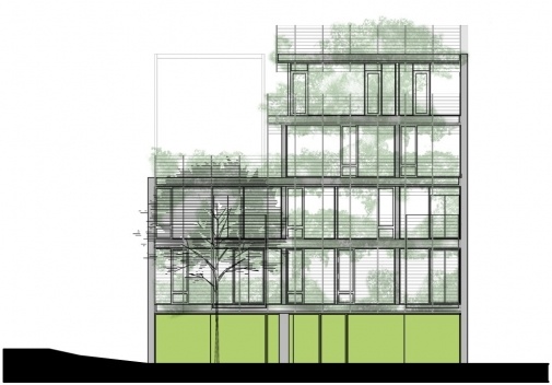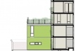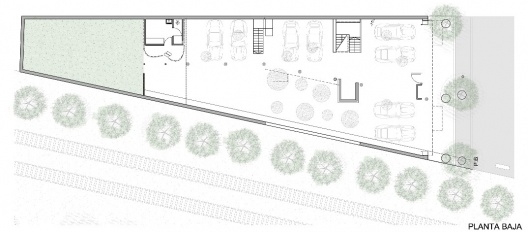 El terreno es entre medianeras, pero una ellas da sobre la vía.del FFCC Debido a esto, el edificio se acomoda en forma de C en 1 y 2 piso, y luego se despega, haciendo frente a la vía en el 3 y 4 piso. Así logramos tener una fachada de 25m de largo, en vez de un muro medianero.
