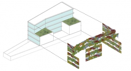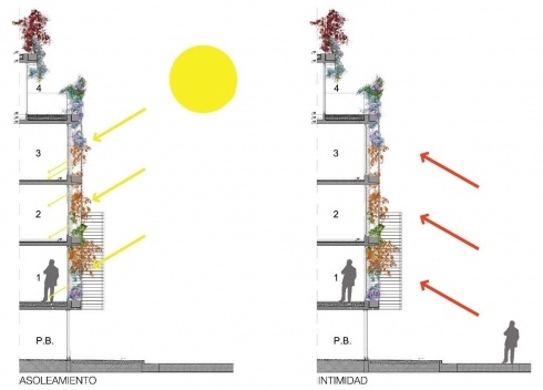 La fachada de plantas incide directamente sobre la calidad medioambiental tanto dentro como fuera del edificio. Las plantas protegen el interior del sol, pero además transforman en naturaleza una obra de arquitectura.