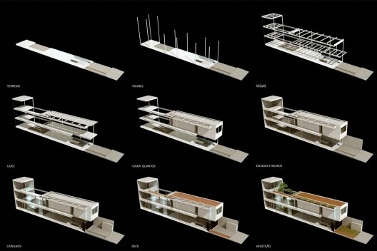 Estruturas em vigas esbeltas de aço, apoiadas em pilares embutidos nas paredes laterais, resultaram em ganho de espaço nessa pequena construção composta de dois blocos de alturas diferentes e apenas 156 metros quadrados; lajes de painel wall, completam o sistema. Resina de poliuretano recobre o piso de toda a área social; a parte íntima recebeu placas de borracha visando redução do peso.
