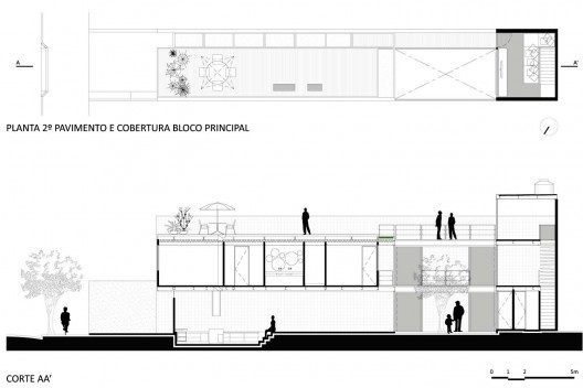Os espaços fechados situam-se no segundo pavimento, dentro da “caixa flutuante” onde estão dois dormitórios e banheiros, Parte dessa caixa, o balanço sobre a fachada frontal, é atirantada; todo o volume foi revestido com painéis de alumínio. Na cobertura, um grande deck, sobre telhas metálicas foi pensado como mais um espaço de fruição. A passarela de tela expandida, portanto transparente, leva ao segundo volume, composto de um pequeno estúdio e a escada que leva ao solário; no térreo estão lavabo e o que seria uma área de serviço.