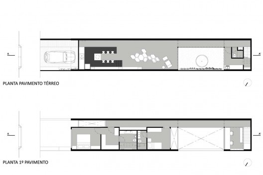 O partido propôs espaços integrados e limitou-se aos usos indispensáveis. “Não é um programa de casa pequeno-burguesa”, avisam. O conceito tradicional foi subvertido; a cozinha volta-se para a fachada frontal e o único acesso da casa se faz por uma passarela elevada ao lado dela, sem obstáculos.