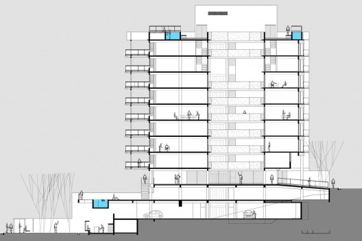 O bloco de circulação vertical (escadas e elevadores) entre os dois apartamentos abre-se para varandas voltadas para o vazio interno como continuidade espacial do pátio de acesso. Junto a cada unidade se alarga e oferece um espaço gentil para entrar nas unidades. Este espaço é o espaço de encontro e convivência.