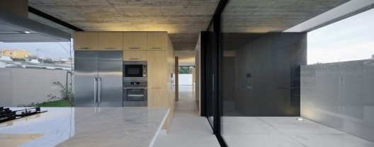 Em coerência com a estratégia de maximizar a presença de espaço exterior ajardinado, a garagem é remetida para uma zona "encaixada" a sul da cozinha. Neste piso localizam-se todos os espaços sociais da habitação.