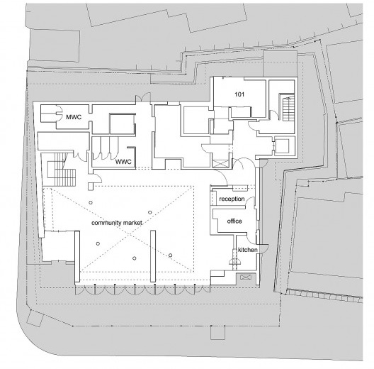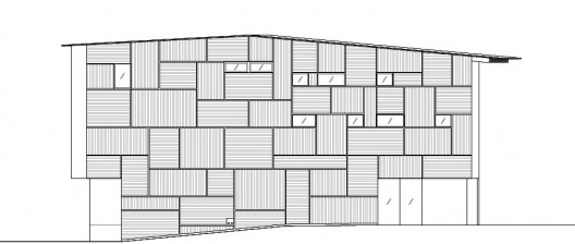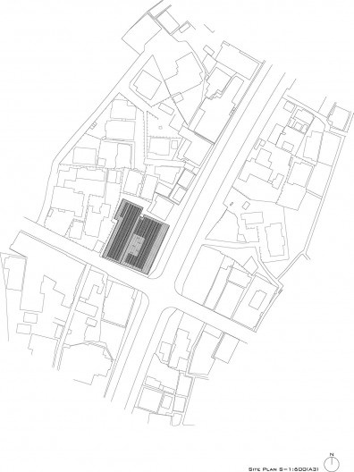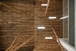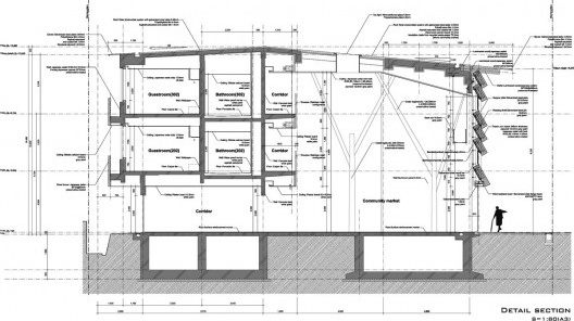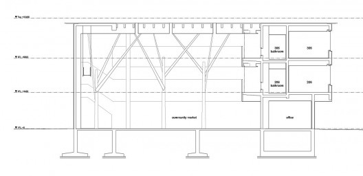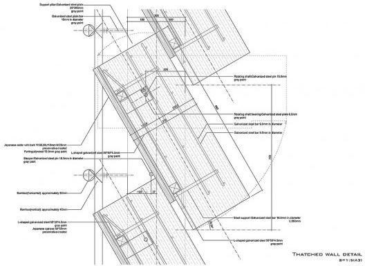 Glass fittings are used for the lower part of the building, including the market’s entrance facing the front road, which can be open at any hour of the day, and on top of it come piles of the straw unit in the module of 2,000×980mm, an unprecedented form for a curtain wall. Normally in a thatched roofing, thatch is fixed vertically against the foundation, in which its cut ends face towards outside. In this building, however, the bunch of thatch is bound horizontally to the foundation, with which the cut end won’t be exposed to rainfalls, and will last long. As another device, pivots are set on the steel mullion at the both ends of each thatch unit, so that it can rotate and take in fresh air from outside, which will make the maintenance of the thatch easier.