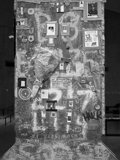 Scale. The World Trade Center was enormous, as was the impact of 9/11. The scale of the original building has been preserved and contributes to the impact of the visit. Foundation Hall is a cathedral-like space, a place of meditation. It is bordered on one side by the North Tower volume and on the other by the 60-foot slurry wall. It also houses the 58-ton steel “Last Column” that was ceremoniously removed from the site on May 30, 2002, marking the official end of the nine-month Ground Zero recovery effort.