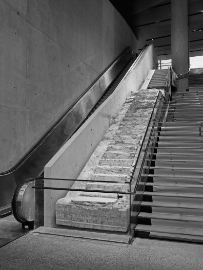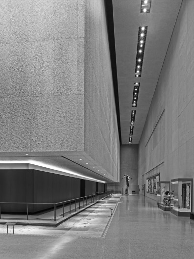 The design team at Davis Brody Bond inherited a fixed set of existing geometries at the site and was faced with the challenge of translating them into a series of coherent spaces that are punctuated by surface, texture, and volume. They chose as the Museum’s main narrative element a gently descending procession (dubbed “the Ribbon”) that guides visitors from the plaza to the bedrock level where the sheared base columns of the World Trade Center towers are revealed. The “Ribbon” recalls the ramp used to remove debris from the site in the aftermath of the attacks. It also offers multiple views of the slurry wall, the original retaining wall that was built to withstand the lateral forces of landfill and river, and which survived the collapse of the towers. At the end of the ribbon, the descent continues down along the Vesey Street Stairs (“Survivors’ Stairs”), which were used by hundreds to escape to safety on 9/11. It ultimately leads to two exhibition spaces and Foundation Hall, the Museum’s culminating space whose sheer scale conveys the enormity of the site and reinforces awareness of the absence of what once was there.