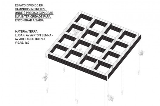 Matérias-brutas elementares como água, terra, areia e pedra são agregadas às estruturas rudimentares para reforçar o estado de elevação de um ambiente urbano efêmero e circunstancial. Neste local, a experiência é outra: o projeto associa-se à escala das dinâmicas geológicas milenares, aos lentos processos de erosão e sedimentação.