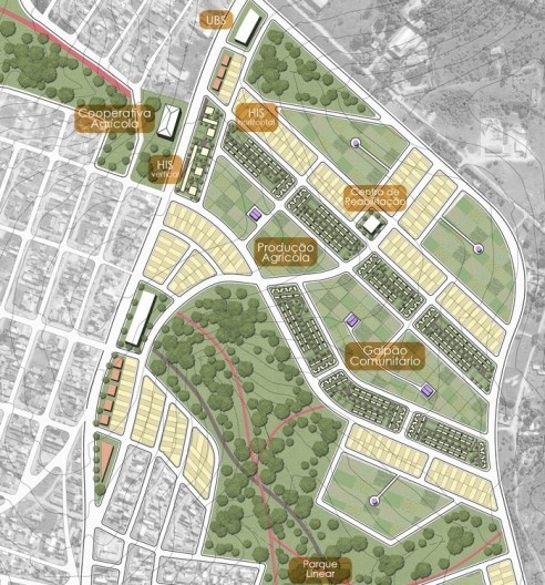 Em suma, a proposta é a mescla de um bairro em que o uso habitacional (construído através de mutirões auto-geridos) e a produção agrícola supervisionada por uma cooperativa que funcionará como articuladora do sistema de plantio, sejam concomitantes.