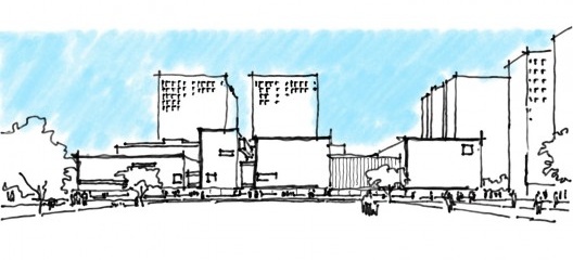 É composta de modo a expressar seus volumes conforme a função e importância. Assim, uma barra linear – abrigando funções diversas de apoio e salas de aula – dá o suporte para 4 expressivos volumes destinados principalmente às grandes salas de ensaio. Estes volumes foram concebidos segundo recomendações elementares da boa acústica, evitando-se o paralelismo das paredes. O restante do território é destinado ao âmbito residencial, onde a demanda de habitações se desenvolve em torres de escalas diversas segundo a condição de cada quadra. A formidável demanda de unidades habitacionais e as dimensões do território em questão nos conduzem a conceber o projeto como uma pequena cidade. Todo o complexo arquitetônico se desenvolve principalmente ao longo de um eixo verde, desenhado como uma praça de dimensões adequadas à escala do complexo.