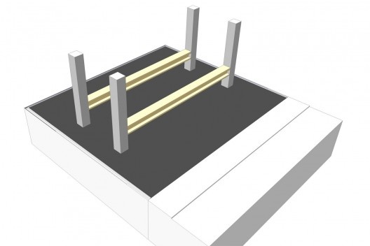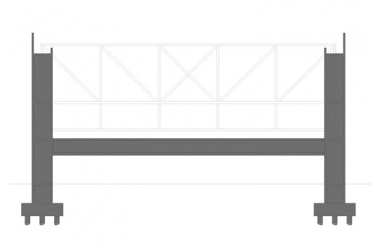 Coisaimilar acontece com os apoios verticais, quatro pilares retangulares com lados medindo aproximadamente 1,3m (3). Os pilares são unidos, dois a dois, por lâminas verticais de concreto que dão rigidez ao conjunto e cuja extensão é maior do que a distância entre pilares. Isso acaba tendo efeito semelhante ao que se viu em relação às vigas de concreto protendido: os planos de concreto escondem a real dimensão dos pilares e, pelo avanço da lâmina externa até o limite da caixa, sugerem que o volume é suportado por um plano quase sem espessura. No interior de cada conjunto de dois pilares e dois planos esbeltos –que no jargão local são chamados de castelos– estão dispostas as instalações, a escada, elevador, sanitário e demais apoios.