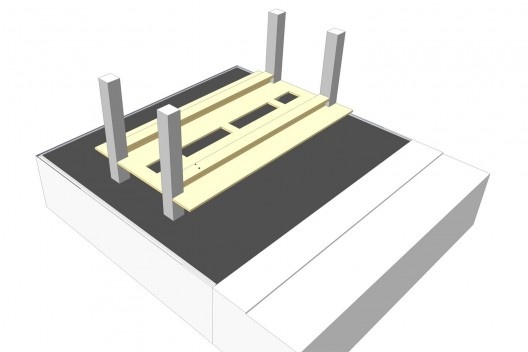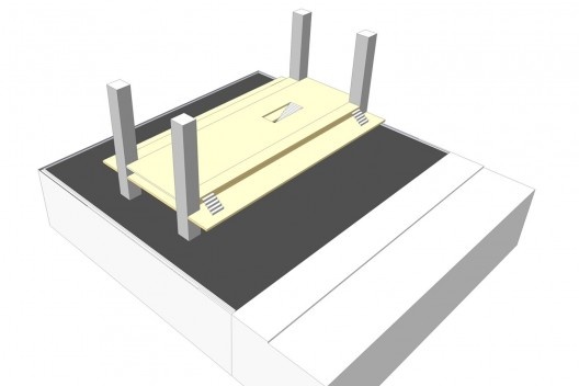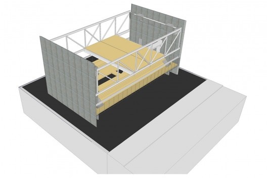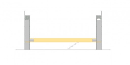 O espaço entre as lajes serve adicionalmente para ocultar a escada levadiça quando a loja está fechada.