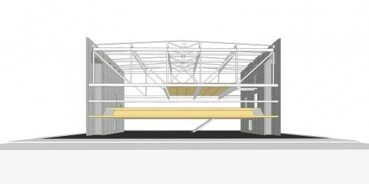 Vigas metálicas de trinta metros de extensão e aproximadamente sete metros de altura constituem as fachadas principal e traseira, resolvendo desse modo a longa e contínua vitrine, que se caracteriza como um intervalo entre viga superior e laje inferior, uma ausência de elementos que, paradoxalmente, adquire um protagonismo essencial (4). Unindo as duas vigas principais aparecem a estrutura da cobertura e o mezanino da loja, o qual aumenta a área de loja ao mesmo tempo em que atua como contraventamento de todo o sistema metálico. Fica assim definido um grande prisma de espaço interior, cuja unidade o mezanino não compromete, absolutamente adequado ao seu propósito de expor móveis contemporâneos.