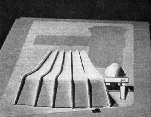 O projeto que apresentamos permite construção bastante econômica e, quanto à circulação e funcionamento, esquemas simples e precisos. No pavimento térreo ficam localizadas as bilheterias e o teatro de comédias com sala de espetáculos para 600 pessoas e serviços anexos como camarins, guarda-roupas, carpintarias, controles, etc. Duas rampas externas condusem à esplanada e ao grande salão e outras diretamente aos balcões na sobreloja. O salão tem capacidade para 3000 espectadores, e o palco, para o qual foram previstos acessos independentes, está servido de todas as instalações necessárias. Quanto à forma da cobertura evitamos o tipo usual em que a parte posterior da platéia e balcões constitue sempre um alto muro vertical (3). A solução adotada, afastando êste inconveniente, garante a obra em apreço aspéto característico e original (4). Um pequeno teatro infantil completa o conjunto.”