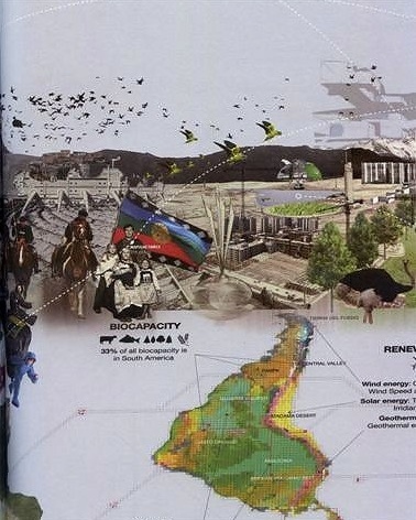 Los trabajos sobre Santiago de Chile, que asumen casi la mitad del relato, se desprenden de la temática canchera para enfocarse en los temas que interesan promover. Así Alejandro Aravena en su firma Elemental nos propone un Metropolitan Promenade cuyo mapeo contrasta con la cartografía del Real Estate de su colega Cuadros Ibañez.