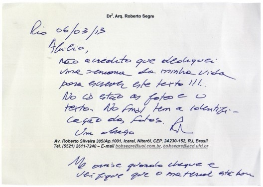 A presente resenha foi enviada pelo Roberto Segre no dia 6 março de 2013 e chegou às mãos do editor no dia 12 de março, dois dias após o trágico falecimento do autor. A mensagem enviada foi a seguinte: “Rio, 06/03/13. Abilio, não acredito que dediquei uma semana da minha vida para escrever este texto!!! No CD estão as fotos e o texto. No final tem a identificação das fotos. Um abraço. RS. Me avise quando chegue (sic) e verifique que (sic) o material está bom”. Era muito comum Roberto Segre nos enviar colaborações pelo correio, principalmente quando envolvia muitas imagens. No caso, parece que a decisão foi providencial para nos legar uma bem humorada mensagem, como também era do seu hábito. Mas esta foi diferente, pois foi póstuma.