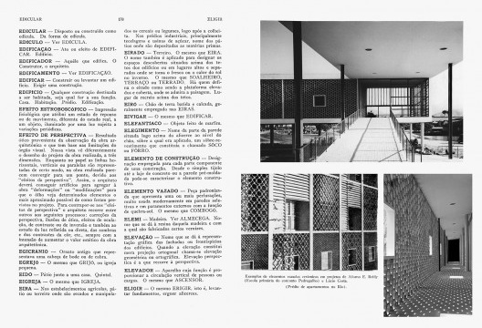 São 512 páginas com os mais variados verbetes sobre a Arquitetura Brasileira. Entre eles termos regionais e do dia a dia de quem milita a profissão. Nele podemos saber que “pé-de-moleque”, além do doce, é também um calçamento de rua, geralmente de seixos rolados. E que “torçado” é a verga da porta. E ainda que o “zimbório” é a parte mais alta e exterior da cúpula de um edifício.