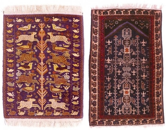Nessa época, Lina passa a me chamar carinhosamente de Victor das Estepes da Ásia Central, uma ubuesca homenagem que aceitei com orgulho. Passado um tempo, essa mesma região, mais precisamente, o Afeganistão, se transforma para mim em objeto de prolongada pesquisa. Em decorrência da invasão “soviética” em 1979, povos nômades pastoris, ali ainda em atividade, passam a incorporar em seus tapetes os novos elementos contemporâneos: tanques, helicópteros, metralhadoras, granadas e minas antipessoais. No princípio, granadas de mão ocupam timidamente o lugar das romãs, dentro do desenho tradicional. A evolução é rápida e criativa, diferentes composições surgem tendo como tema central a violenta e prolongada realidade bélica promovida por sucessivos invasores. Um retrato escancarado e cínico. O que me fez relacionar Ubu, Polochon e Cia. com esses tapetes não é obviamente a coincidência geográfica mas a crua e efetiva denuncia das tiranias.